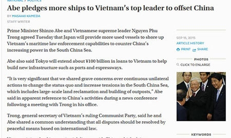 Báo Japan Times mở đầu bài viết với nội dung thông báo về việc Nhật Bản sẽ cung cấp thêm tàu cho Việt Nam để tăng cường các hoạt động chấp pháp trên biển. Cùng với đó, lãnh đạo Nhật Bản cũng cam kết bổ sung khoản vay 100 tỷ Yên để giúp Việt Nam xây dựng các cơ sở hạ tầng như cầu cảng và đường cao tốc.