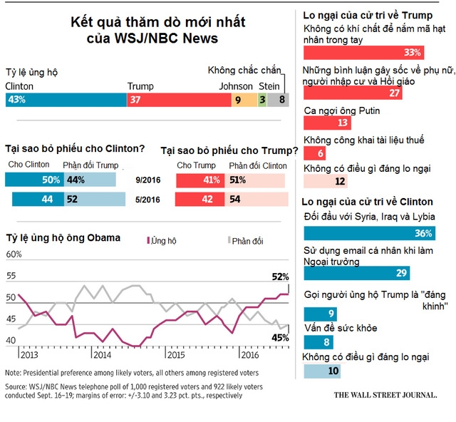 Sau khi trải qua một tuần đầy khó khăn với những lo lắng về sức khỏe và bị “vạ miệng” vì gọi những người ủng hộ ông Trump là “đáng khinh”, bà Clinton đã quay trở lại đường đua và hiện đang dẫn trước ông Trump 6 điểm phần trăm. Bà nhận được tỷ lệ ủng hộ 43%, so với mức 37% của đối thủ.