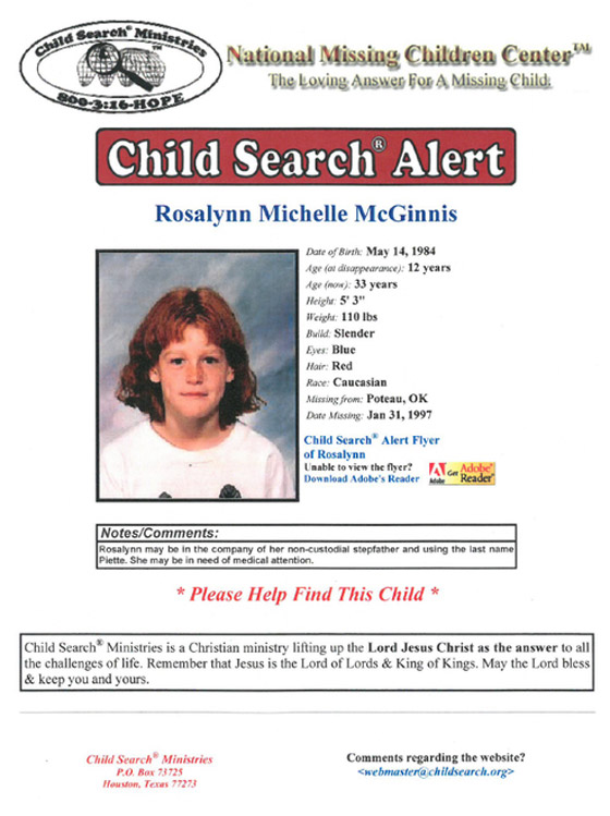 Theo tài liệu 41 Action News có được từ Sở Cảnh sát Poteau, chiều ngày 31/1/1997, McGinnis khi đó đang học lớp 6 tại trường trung học Pansy Kidd ở Poteau, Oklahoma, một người đàn ông đã đón cô bé từ trường và đưa cô đến một khách sạn ở Tulsa. Người đàn ông đó là Piette. "Tôi không biết chuyện gì đang xảy ra. Điều tiếp theo tôi biết là mẹ không có ở đó, anh em trai cũng không. Không một ai trong gia đình tôi ở đó, ngoại trừ tôi và hắn ta", McGinnis nhớ lại.