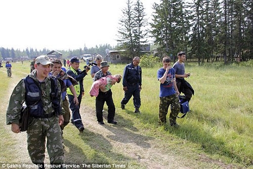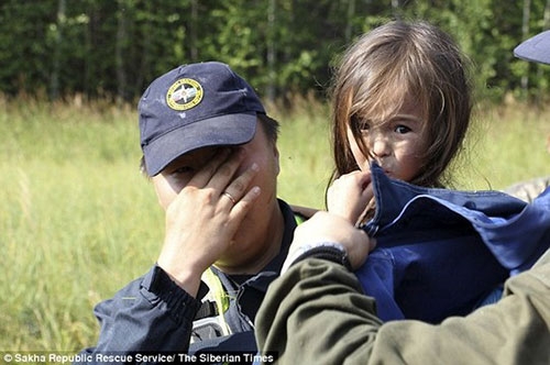 | ...cô bé tỏ ra không quá sợ hãi trong khi một nhân viên cứu hộ rơi nước mắt vì tìm thấy em. Ảnh: Siberian Times |