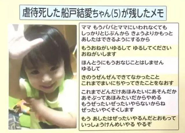 Tháng 3/2018, cô bé 5 tuổi tên Yua Funato đã qua đời trong sự tiếc thương vô vàn của mọi người. Trước khi chết, Yua chỉ nặng vỏn vẹn 12kg, đây là trọng lượng của đứa bé 2 tuổi và Yua đã phải rời xa thế giới này trong tình trạng như thế. Sau khi cảnh sát Tokyo được báo cáo đã ngay lập tức vào cuộc điều tra và bắt giữ mẹ ruột tên Yuri, 25 tuổi và bố dượng là Yudai Funato, 33 tuổi với tội danh ngược đãi trẻ em, không hoàn thành trách nhiệm nuôi dạy con và gây ra cái chết thương tâm cho đứa trẻ vào ngày 6/6/2018.