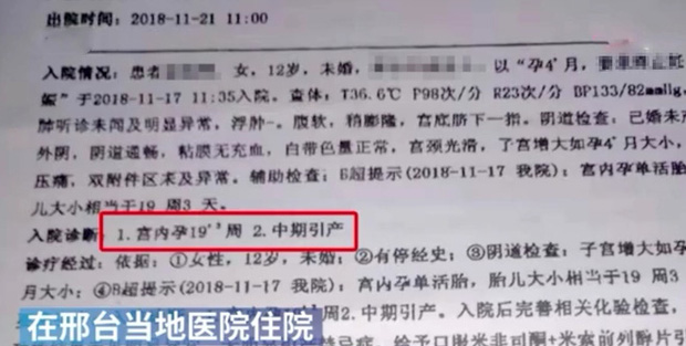 Khi trả lời phỏng vấn, anh Lưu đã cung cấp cho phóng viên hồ sơ khám bệnh của con gái anh tại một bệnh viện địa phương ở Hình Đài vào ngày thứ năm sau khi phát hiện cô bé mang thai (ngày 17/11/2018). Kết quả chẩn đoán cho thấy cô bé đã mang thai 19 tuần 2 ngày.