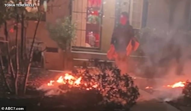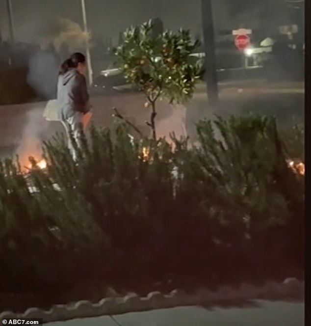 Hàng xóm Elena De La Cruz Rezyo kể lại với đài ABC7 rằng bà đã chứng kiến người phụ nữ châm lửa đốt cây cối khô trong sân trước, tay cầm một cây gậy vung vẩy. "Cô ấy bắt đầu đốt lửa, cầm một cây gậy và đứng ở hiên nhà". Người phụ nữ này sau đó được cho là đã lấy một cái nồi, giấy và bắt đầu châm lửa vào đống củi trước khi chạy đến gần cửa nhà hàng xóm, tay vẫn cầm tờ giấy đang cháy.