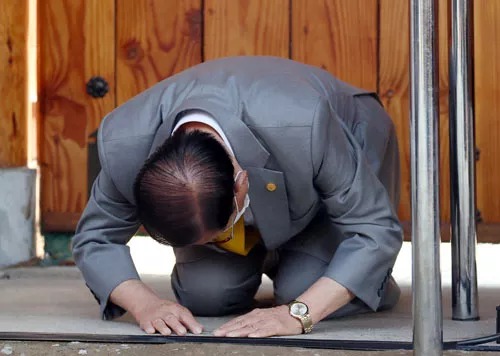 Giáo chủ Tân Thiên Địa Lee Man-hee quỳ gối xin lỗi trong cuộc họp báo tại quận Gapyeong - Hàn Quốc hôm 2-3 Ảnh: REUTERS