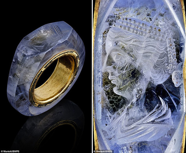 Trong bộ sưu tập ấy, đáng chú ý nhất phải kể đến chiếc nhẫn sapphire gần 2.000 năm tuổi bởi nó không chỉ đơn giản là một món đồ trang sức đẹp về mặt thẩm mỹ mà còn chứa đựng giá trị lịch sử. Chiếc nhẫn đặc biệt gây sự chú ý bởi hình ảnh một người phụ nữ được khắc vô cùng tỉ mỉ, công phu trên mặt đá Sapphire.