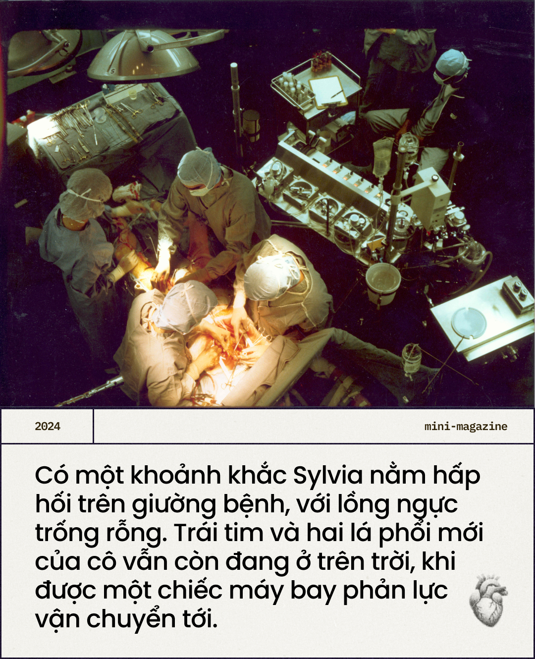 Toàn bộ sự sống của Sylvia khi đó được duy trì bởi một cỗ máy tim phổi nhân tạo ECMO, trong khi, trái tim và hai lá phổi mới của cô ấy vẫn còn đang ở... trên trời. Chúng đang được vận chuyển đến New England bằng một chiếc Learjet, chuyên cơ phản lực hiện đại nhất thời điểm đó.
