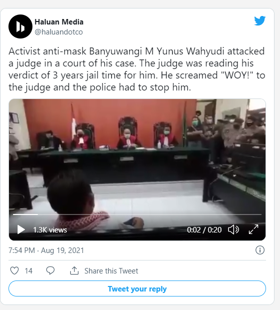 Hôm thứ Năm, 19/8 vừa qua, Yunus Wahyudi đã phải ra hầu tòa tại Banyuwangi, Đông Java cho sai phạm của mình. Tuy nhiên, dù phải ra tòa, thái độ của Yunus cũng cho thấy anh ta không hối lỗi chút nào. Tại tòa, trong khi tất cả mọi người đều đeo khẩu trang để phòng dịch thì Yunus cũng chẳng thèm đeo khẩu trang và thi thoảng còn mỉm cười rất ngang nhiên và thách thức.