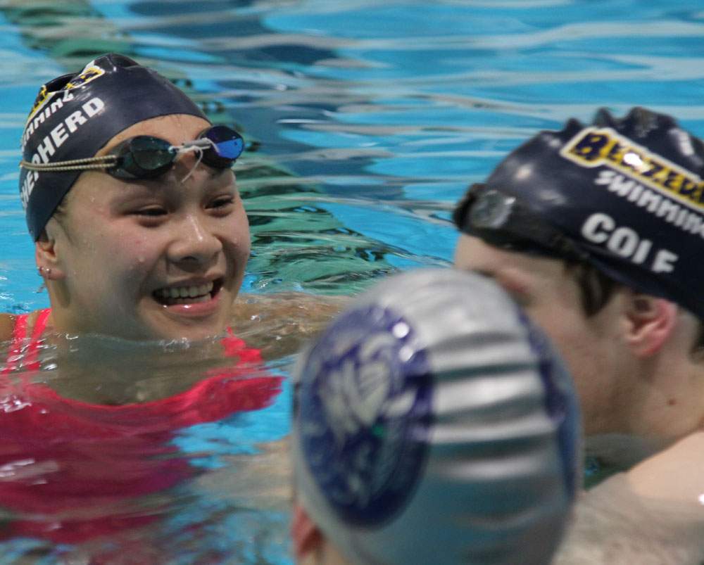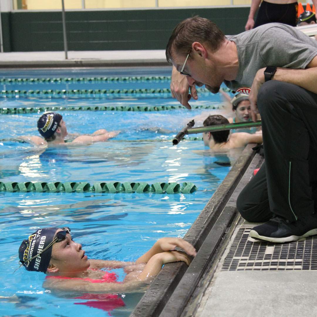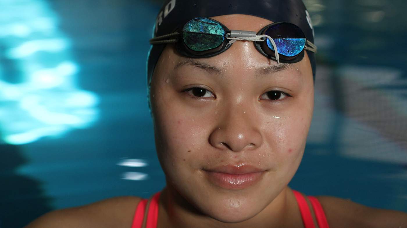 Haven Shepherd quỳ trên tấm ván nhảy đặt sát mép hồ bơi của trường, hít thở thật sâu và lao mình xuống nước.