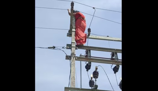 Video chia sẻ trên mạng xã hội cho thấy người phụ nữ bất ngờ trèo lên cột điện cao thế, khiến hàng xóm hoảng sợ kêu gọi cô bình tĩnh. Người phụ nữ sau đó bám chặt vào cột điện.