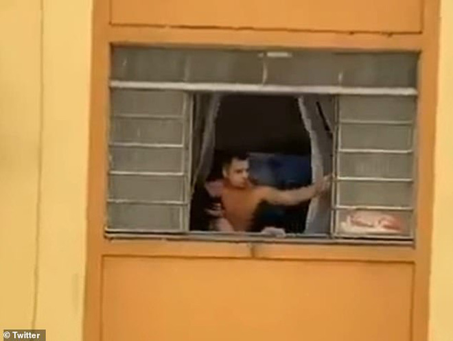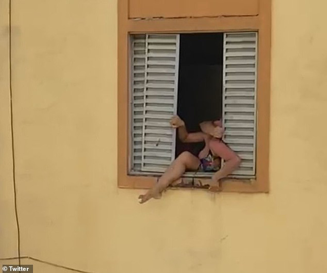 Tuy nhiên, khi mới chỉ đền gần cửa sổ, chưa kịp trèo hẳn ra bên ngoài, thì cô đã bị chồng mình là Vitor Batista, 32 tuổi kéo quay trở lại một cách rất thô bạo. Đoạn video khác cho thấy bà mẹ này ngả người về sau ngưỡng cửa sổ. Sau khi bị chồng lôi giật lại vào bên trong, cả hai tiếp tục xảy ra ẩu đả cãi vã lớn, người đàn ông cũng cố đóng cửa sổ lại để ngăn chặn án mạng xảy ra.