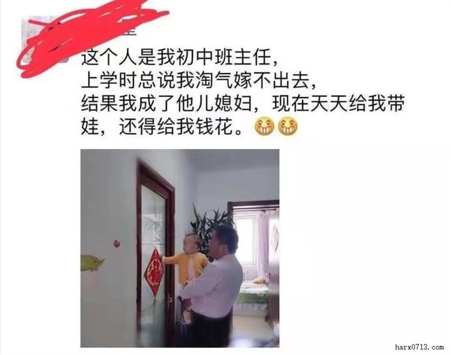 Nguyên văn chia sẻ của cô nàng: "Đây là thầy chủ nhiệm cấp 2 của tôi. Thời đi học, thầy luôn bảo tôi nghịch quá, sẽ không thể gả đi được. Kết quả là tôi đã trở thành con dâu của thầy. Bây giờ á, mỗi ngày thầy phải chăm con giúp tôi, còn phải cho tôi tiền xài nữa". Cô học trò ngày nào còn đăng tải kèm một tấm ảnh của bố chồng (tức là thầy chủ nhiệm cũ) đang ẵm con trai mình.