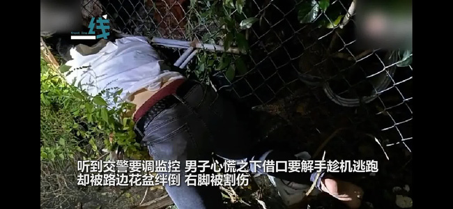 Vì cho rằng không thể xác định được người cầm lái qua lời khai, cảnh sát đã gọi điện nhờ tổng đài kiểm tra camera an ninh. Vừa nghe thấy điều này, người đàn ông bỗng trở nên hốt hoảng co chân bỏ chạy khỏi hiện trường. Không ngờ chưa chạy được bao xa, anh ta đã vấp chai thủy tinh và ngã vào bãi cỏ ven đường.