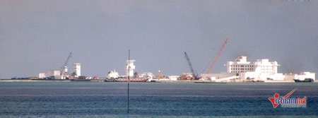 Toàn cảnh các công trình xây dựng trái phép của TQ trên đảo Gạc Ma, bao gồm tòa nhà trung tâm cao 6 tầng, các tháp quan sát không lưu cùng các hệ thống cần cẩu, tàu vận tải hoạt động liên tục. (Ảnh: Huy Phong) |