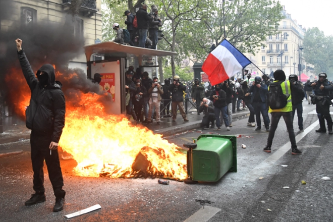 Tại Pháp, những người biểu tình mặc áo đen, đội mũ trùm đầu đã đụng độ với cảnh sát ở Paris trong cuộc biểu tình với sự tham gia của hàng nghìn người hôm 1/5 (giờ địa phương) nhằm đòi công bằng xã hội và kinh tế, đồng thời lên tiếng phản đối kế hoạch thay đổi trợ cấp thất nghiệp của chính phủ.