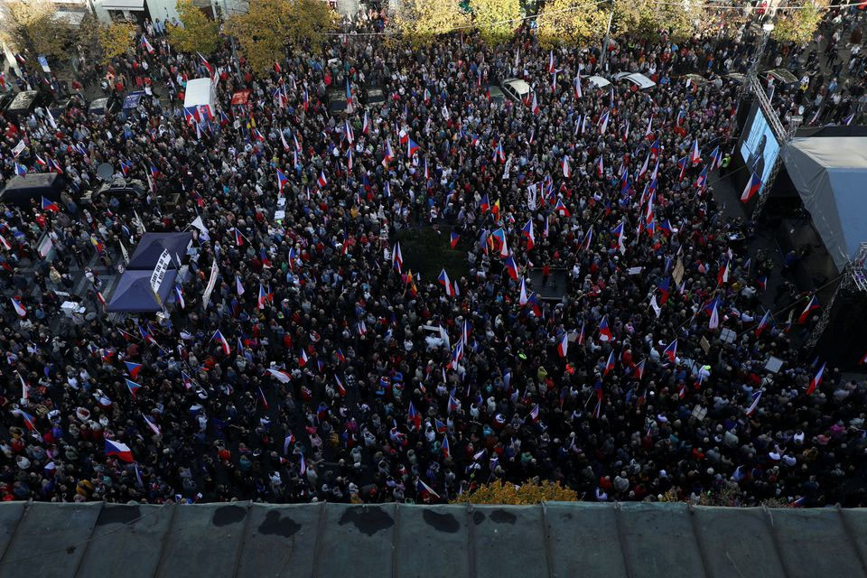 Những người biểu tình vẫy quốc kỳ Séc, hô vang khẩu hiệu "Từ chức, từ chức" và mang theo các biểu ngữ đòi đưa đất nước ra khỏi NATO và EU.