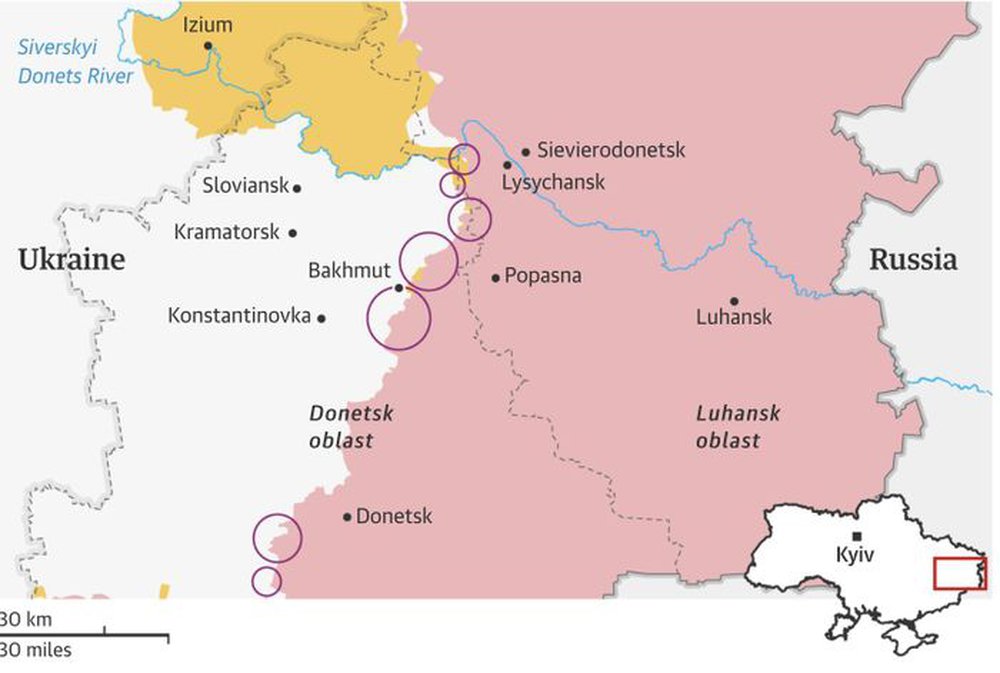 Trong khi vẫn còn dân thường ở các thị trấn và làng mạc xung quanh Bakhmut, thành phố từng là nơi sinh sống của 72.000 người, đang bị tấn công từ hai hướng này là bằng chứng về quy mô của cuộc xung đột đang tiếp diễn ở khắp mọi nơi.