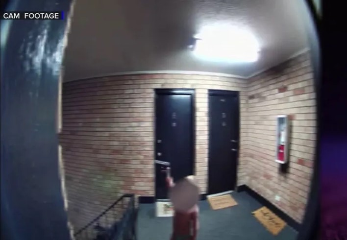 Video từ camera an ninh của một người hàng xóm chiếu trên chương trình “On Patrol: Live” cho thấy bé trai cầm súng đứng trước cửa một tòa chung cư và bóp cò.