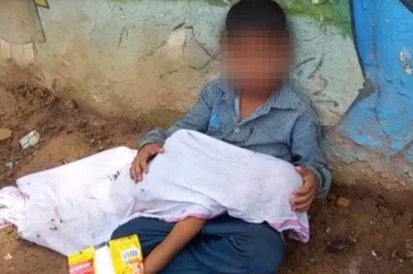 Hình ảnh do một nhà báo địa phương quay được cho thấy cậu bé Gulshan, 8 tuổi đang ngồi bên thi thể của cậu em trai 2 tuổi Raja khi cha của các em là Poojaram Jatav phải đi tìm kiếm một chiếc xe có thể nhận đưa họ về nhà để làm lễ an táng cho người con xấu số.