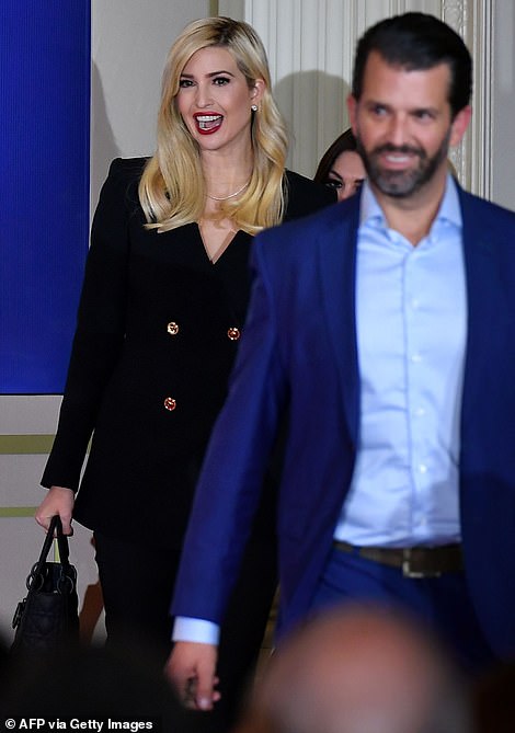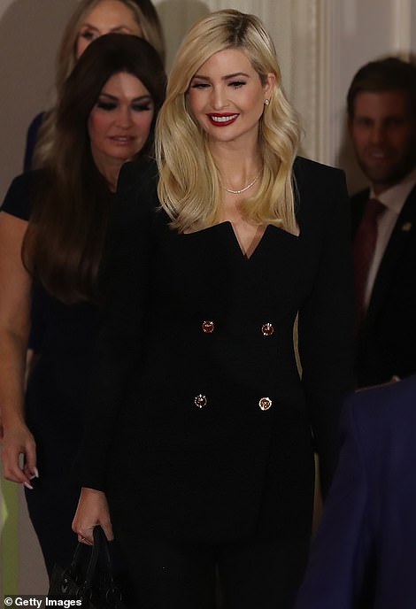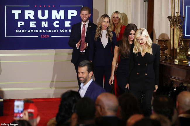 Sau đó, các con trai, con gái cùng dâu rể của ông Donald Trump lại tiếp tục di chuyển tới phòng phía Đông để cổ vũ cho bài phát biểu vào lúc 2h30 sáng (theo giờ địa phương) của bố. Dẫn đầu đại gia đình bước ra từ cửa hông sân khấu là con trai cả Donald Trump Jr. Tiếp sau đó là con gái Ivanka Trump, nữ luật sư Guilfoyle - bạn gái mới của Trump Jr., con trai Eric và con dâu Lara Trump, con gái Tiffany và bạn trai Michael Boulos.