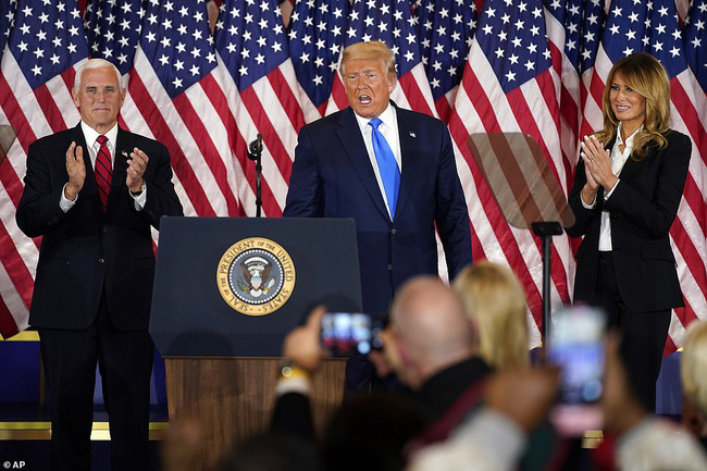 Ông Trump và bà Melania bước ra sau cùng, đồng thời đi lên bục phát biểu. Tổng thống 74 tuổi rất tự tin chiến thắng dù chưa có kết quả cuối cùng.