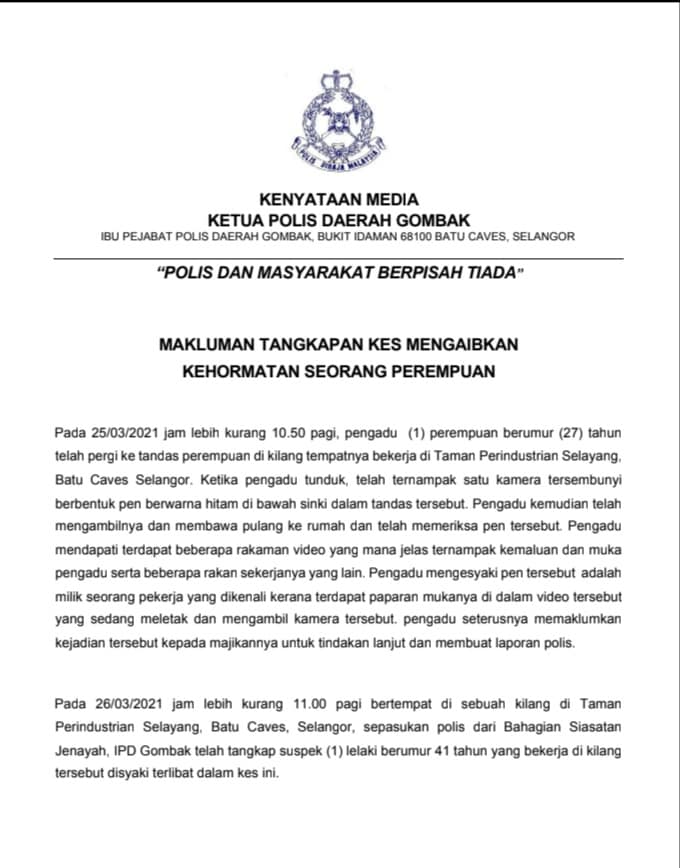 Tờ tin tức Berita Harian cho hay sự việc xảy ra tại nhà máy ở Khu công nghiệp Batu Caves, quận Gombak, bang Selangor, Malaysia. Cảnh sát trưởng quận Gombak, ông Arifai Tarawe, cho biết camera quay lén được ngụy trang dưới dạng một cây bút bị phát hiện bởi một phụ nữ 27 tuổi làm việc trong nhà máy này.
