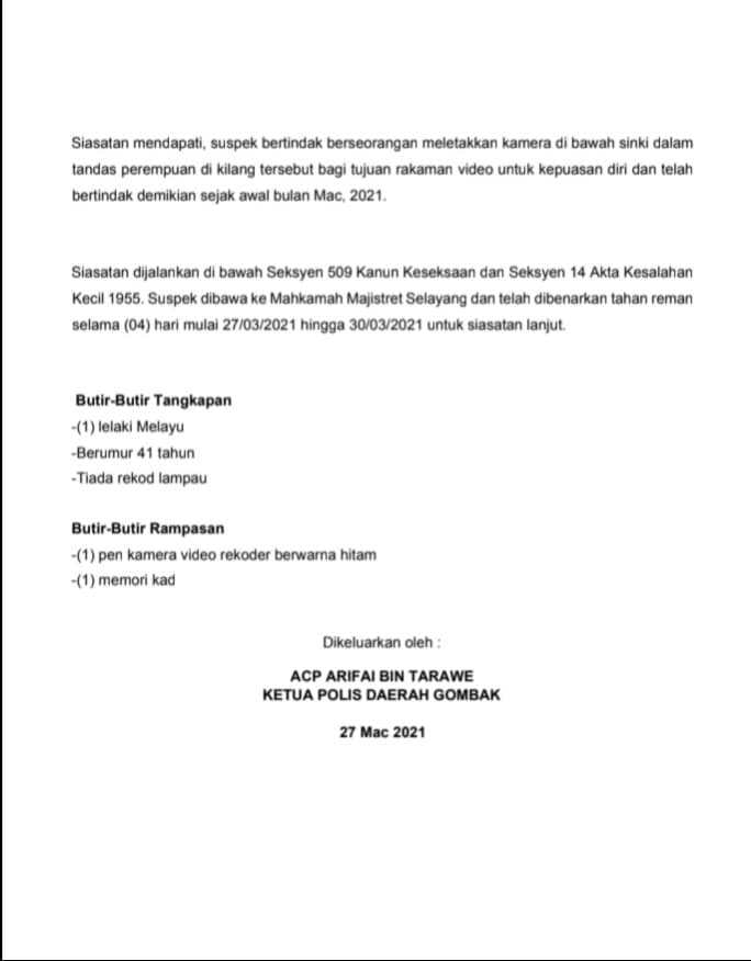 Trong khi đó, một chiếc bút có gắn thẻ nhớ đã bị tịch thu và vụ việc hiện đang được điều tra theo Mục 509 của Bộ luật Hình sự Malaysia và Mục 14 của Đạo luật về tội phạm trẻ vị thành niên năm 1955. Nghi phạm cũng được di lý trong 4 ngày kể từ ngày 27 tháng 3 để hỗ trợ điều tra.