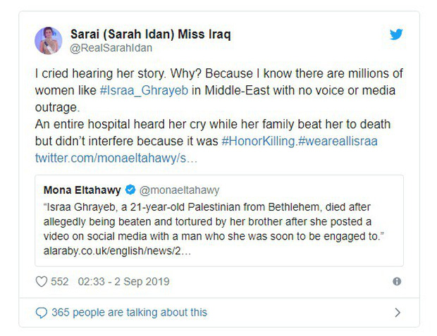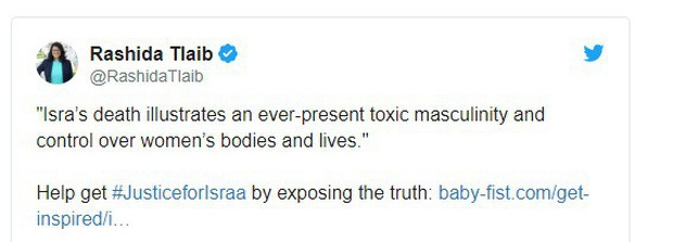 Nghị sĩ người Mỹ gốc Palestine Rashida Tlaib nói rằng, cái chết của Israa chính là minh chứng cho “vấn đề nam tính độc hại vẫn luôn tồn tại và sự kiểm soát cơ thể cũng như tính mạng của phụ nữ”.