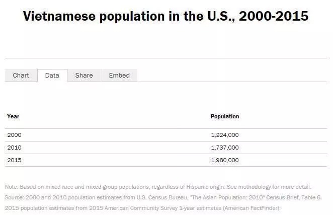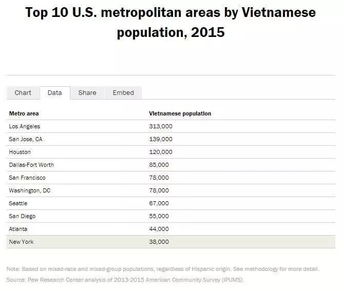 Với ước tính 2,2 triệu người sống tại Mỹ, người gốc Việt hiện là cộng đồng thiểu số lớn thứ tư tại Mỹ, sau người Mỹ gốc Hoa, gốc Ấn Độ và gốc Philippines, theo Cục Điều tra dân số Mỹ. Kể từ năm 1975, số người Việt đến Mỹ tăng gấp đôi mỗi 10 năm và cho đến những năm 2000, tốc độ gia tăng là 26%.