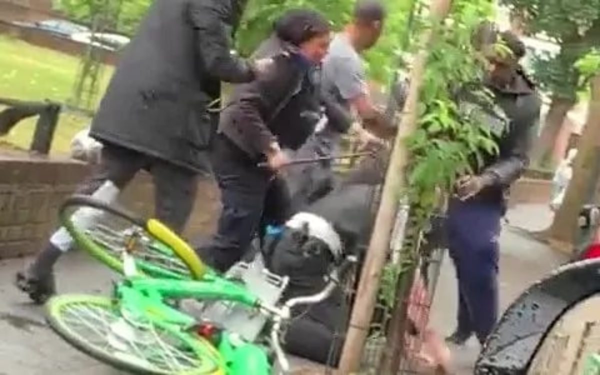 Video lan truyền trên mạng xã hội cho thấy nam sĩ quan cảnh sát bị đè xuống mặt đường và bị đá, trong khi đồng nghiệp nữ của anh bị xô đẩy khi định can thiệp.