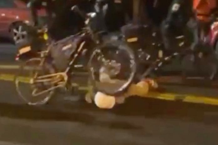Video ghi lại vụ việc hôm 23/09 được đăng tải trên Twitter cho thấy một người biểu tình nằm trên mặt đường, và một sĩ quan cảnh sát dắt xe đạp đè qua đầu và cổ người này. Các cảnh sát có mặt đã nhanh chóng bao vây hiện trường.