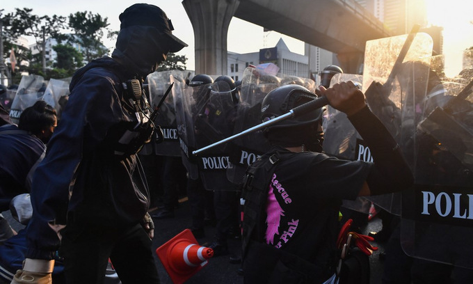Cảnh sát Thái Lan triển khai lực lượng chống bạo động để đối phó với những hành động quá khích. Hình ảnh tại hiện trường cho thấy người biểu tình bịt mặt dùng hung khí tấn công cảnh sát, trong khi lực lượng an ninh bắn đạn khói để giải tán đám đông.