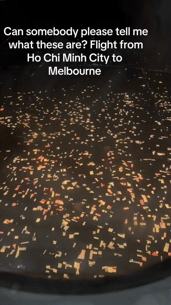Đoạn phim được anh chàng đăng tải cho thấy ngoài cửa sổ máy bay là hình ảnh những ô vuông màu neon vàng và đỏ như những mảnh pháo giấy được bắn lên không trung và phát sáng rực rỡ. Ở phần mô tả, chàng trai này viết: "Ai cho tôi biết cái này là gì được không? Trên chuyến bay từ TP.HCM đến Melbourne".