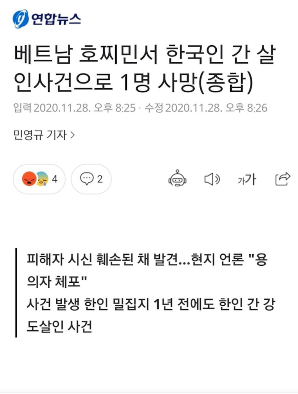 Tờ Chosun đưa tin ngày 29/11 với tựa đề: “Một doanh nhân Hàn Quốc ở TP.HCM, Việt Nam giết người Hàn Quốc”.