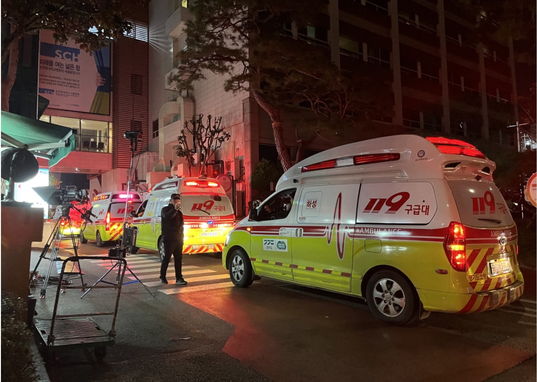 Bên ngoài bệnh viện trường Đại học Soonchunhyang, cách khu Itaewon khoảng 950m, nhiều bậc cha mẹ đang chờ tin con trong thời tiết se lạnh của tháng 10. Trong nhiều giờ đồng hồ, những chiếc xe cấp cứu trống không từ khắp mọi nơi ở Hàn Quốc tới bệnh viện này để mang thi thể các nạn nhân thiệt mạng đi. Từ nhà xác của bệnh viện, một chiếc băng ca đưa một thi thể được phủ trong tấm vải trắng tới một xe cấp cứu đang chờ. Sau đó, hết thi thể này tới thi thể khác được đưa ra xe.
