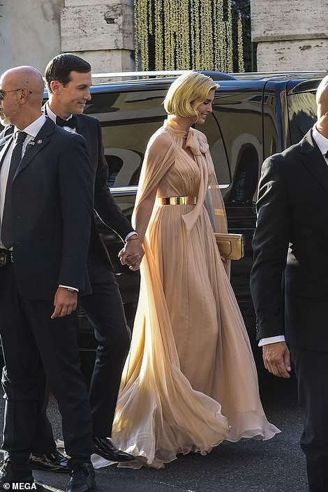 Con gái Tổng thống Mỹ thu hút sự chú ý khi tỏa sáng như một nữ thần trong chiếc đầm màu hồng nhẹ nhàng. Ivanka Trump tình tứ nắm tay người chồng điển trai của mình đi dự tiệc. Người hâm mộ đã rất mong chờ màn so găng giữa Meghan Markle và Ivanka Trump khi lần đầu tiên họ chạm trán nhau.