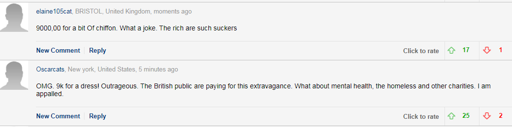 Nhiều người bày tỏ sự thất vọng và giận dữ khi một lần nữa Meghan Markle thể hiện sự tiêu xài hoang phí của mình, chi một số tiền lớn cho trang phục dự tiệc cưới. Chiếc đầm của nàng dâu hoàng gia bị chê là quá xuề xòa với những chi tiết rườm rà, không phù hợp với vóc dáng khiến Meghan Markle kém nổi bật, chìm nghỉm giữa dàn khách mời nổi tiếng.
