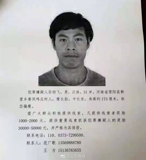 Qua điều tra sơ bộ, nghi phạm là Tôn Hằng Phi, 31 tuổi, sống cùng làng với các nạn nhân. Sau khi gây án, hắn bỏ trốn trên một chiếc xe việt dã màu trắng. Khi đến bờ sông Hoàng Hà, hắn đã bỏ xe tại đây và biến mất, nghi ngờ đã nhảy xuống sông tự tử.