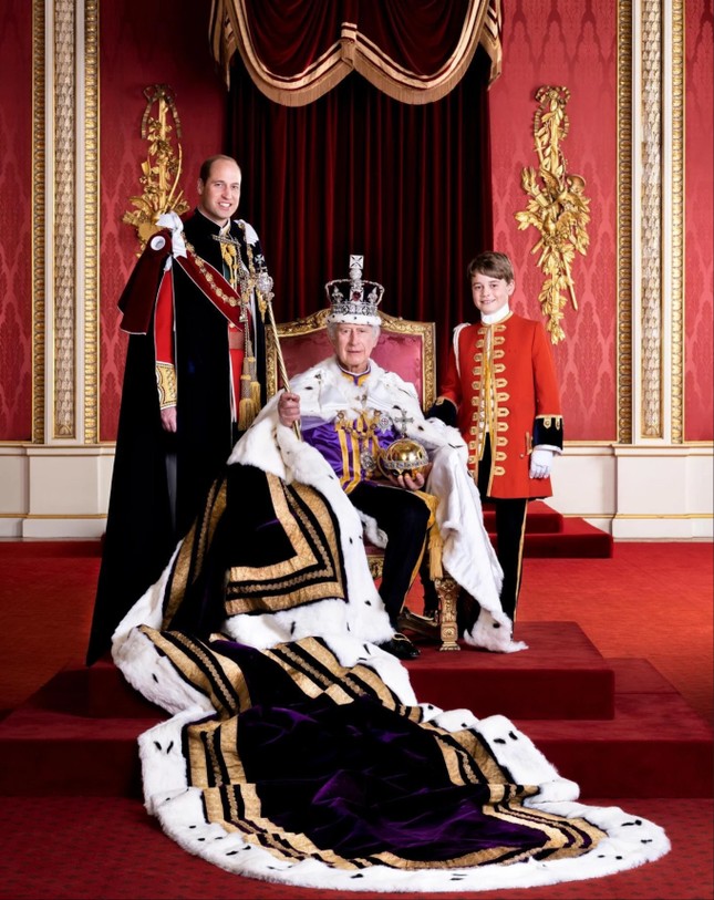 Sau lễ đăng cơ ngày 6/5, Hoàng gia Anh thực hiện nhiều bức ảnh ghi lại khoảnh khắc lịch sử của Vua Charles. Sau bức ảnh tân vương ngồi trên ngai vàng, Điện Buckingham tiếp tục chia sẻ khoảnh khắc ông Charles chụp cùng con trai William và cháu nội George.