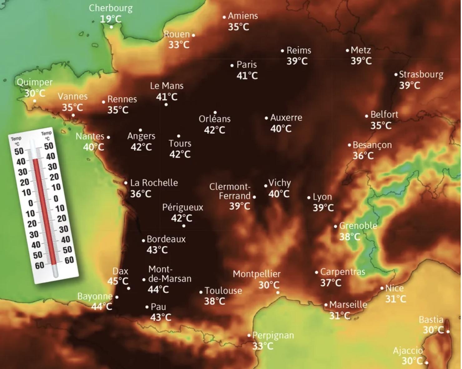 Theo Meteo-France, nhiệt độ ở một số khu vực của Pháp hôm qua đã lên tới 45 độ C. Nhà khí hậu học Matthieu Sorel thuộc Meteo-France nói: "Đây là đợt nắng nóng sớm nhất từng được ghi nhận ở Pháp". 3/4 dân số nước Pháp, tức 45 triệu người, bị ảnh hưởng bởi đợt nắng nóng kỷ lục.