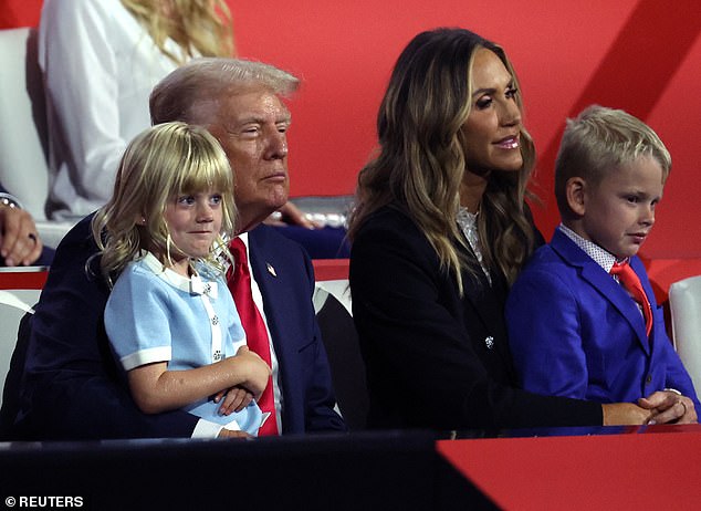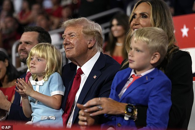 Tối ngày 18/7 vừa qua, gia đình ông Trump đã có mặt đông đủ để ủng hộ cho bài phát biểu của Eric Trump, con trai thứ ba của ông. Trong số đó, hai con nhỏ của Eric là Carolina (4 tuổi) và Luke (6 tuổi) là tâm điểm chú ý khi lần lượt ngồi trên đùi ông nội và mẹ là Lara Trump.