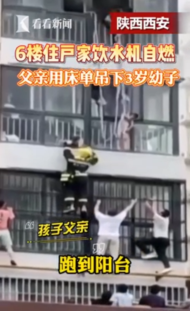 Được biết, sự việc xảy ra tại tầng 6 ở một khu chung cư ở thành phố Tây An (Trung Quốc). Trong cơn nguy kịch, người cha đã dùng dây thừng trói chặt con và treo cổ đứa con 3 tuổi rồi thả cô bé xuống cho lực lượng cứu hộ đang đứng ở dưới.