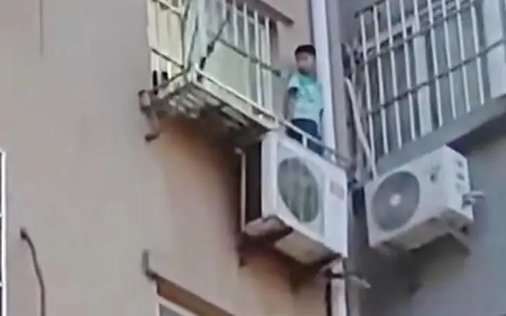 Một đoạn video được ghi lại vào ngày 25/6 tại tỉnh An Huy, miền đông Trung Quốc cho thấy một cậu bé chừng 6 tuổi, mặc bộ quần áo màu xanh đang phải trốn trên cục nóng điều hòa ở tầng 5 của một khu chung cư. Bé trai sợ hãi gào khóc trong khi mẹ em vẫn cầm cây sào dài liên tục vung ra ngoài cửa sổ và vụt vào người em.