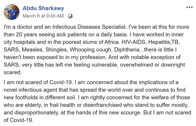 Ông Abdu Sharkawy, một bác sĩ và chuyên gia về bệnh truyền nhiễm tại trường Đại học Toronto, Canada, hôm thứ 6 vừa qua đã bất ngờ gây chấn động mạng xã hội với bài chia sẻ về "nỗi sợ" thời dịch bệnh COVID-19, tính đến thời điểm hiện tại đã có hơn 330.000 lượt thích và 837.000 lượt chia sẻ trên mạng xã hội Facebook.
