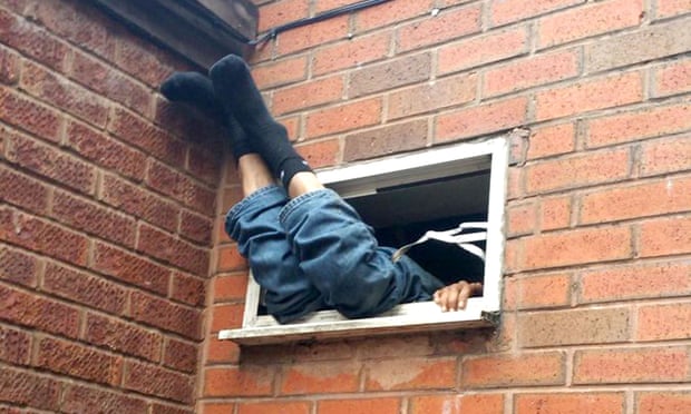 Một bức ảnh do Cảnh sát West Midlands chụp cho thấy tên trộm đang thò 2 chân ra khỏi ô thoáng. Ngay sau khi được giải cứu, hắn đã bị cảnh sát giam giữ.