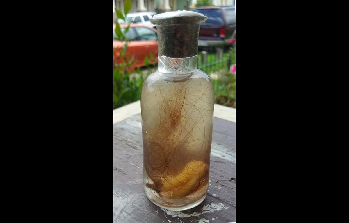 Shane Mears gạt bụi và nhìn vào bên trong. Cảnh tượng đáng sợ hiện lên, bên trong chiếc lọ kỳ quái có chứa 1 chiếc răng, vài sợi tóc, một con bọ hung và có lẽ là một ít nước tiểu.