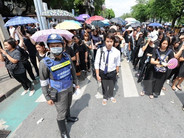 Người dân Thái Lan đến viếng Nhà vua Bhumibol Adulyadej tại Hoàng cung ở thủ đô Bangkok ngày 15/10. (Nguồn: THX/TTXVN) |