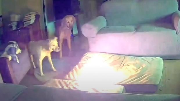 Đoạn video về vụ hỏa hoạn được cho là xảy ra vào tháng 5 năm nay cho thấy một con chó đã nhai chiếc điện thoại khiến cục pin phát ra những tia lửa và bùng cháy khiến thủ phạm cùng con chó và một con mèo đang ngủ gần đó phải bỏ chạy.