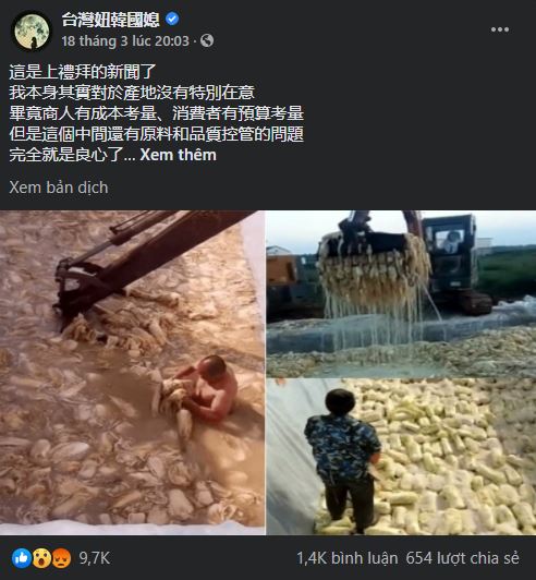 Thế nhưng, không ngờ mấy hôm trước cô bất ngờ nhìn thấy một báo cáo về quy trình sản xuất kim chi và ớt bột ở Trung Quốc khiến cô sợ hãi, từ đây cô bắt đầu chú ý đến nguồn gốc của nguyên liệu. Trong hình ảnh nữ blogger Đài Loan chia sẻ có thể thấy được, một người đàn ông khỏa thân ngâm trong đống kim chi khiến cô chết lặng. “Nghiêm túc đây, tôi đã thật sự buồn nôn khi nhìn thấy cảnh này”, cô nói trong bài đăng.