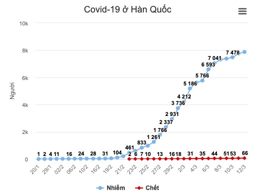 Hàn Quốc sáng nay ghi nhận 114 ca nhiễm mới, nâng số ca nhiễm bệnh trên toàn quốc lên 7.869. Số ca nhiễm mới hôm qua là 242, thấp hơn nhiều so với mức tăng trên 500 ca mỗi ngày vào tuần trước. Là "ổ dịch" Covid-19 lớn thứ tư thế giới, nhưng Hàn Quốc tới nay mới ghi nhận 66 người tử vong, thấp hơn rất nhiều so với 354 ca tử vong của nước xếp thứ ba là Iran.