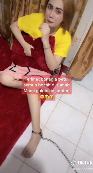 Ảnh chụp từ video cho thấy cô vợ ngồi trên giường, tay cầm gối ôm, chân đeo xích sắt nhỏ màu đen. Video có dòng chữ "Tôi như thế này là bởi chồng tôi bắt gặp đang quay video cho TikTok".
